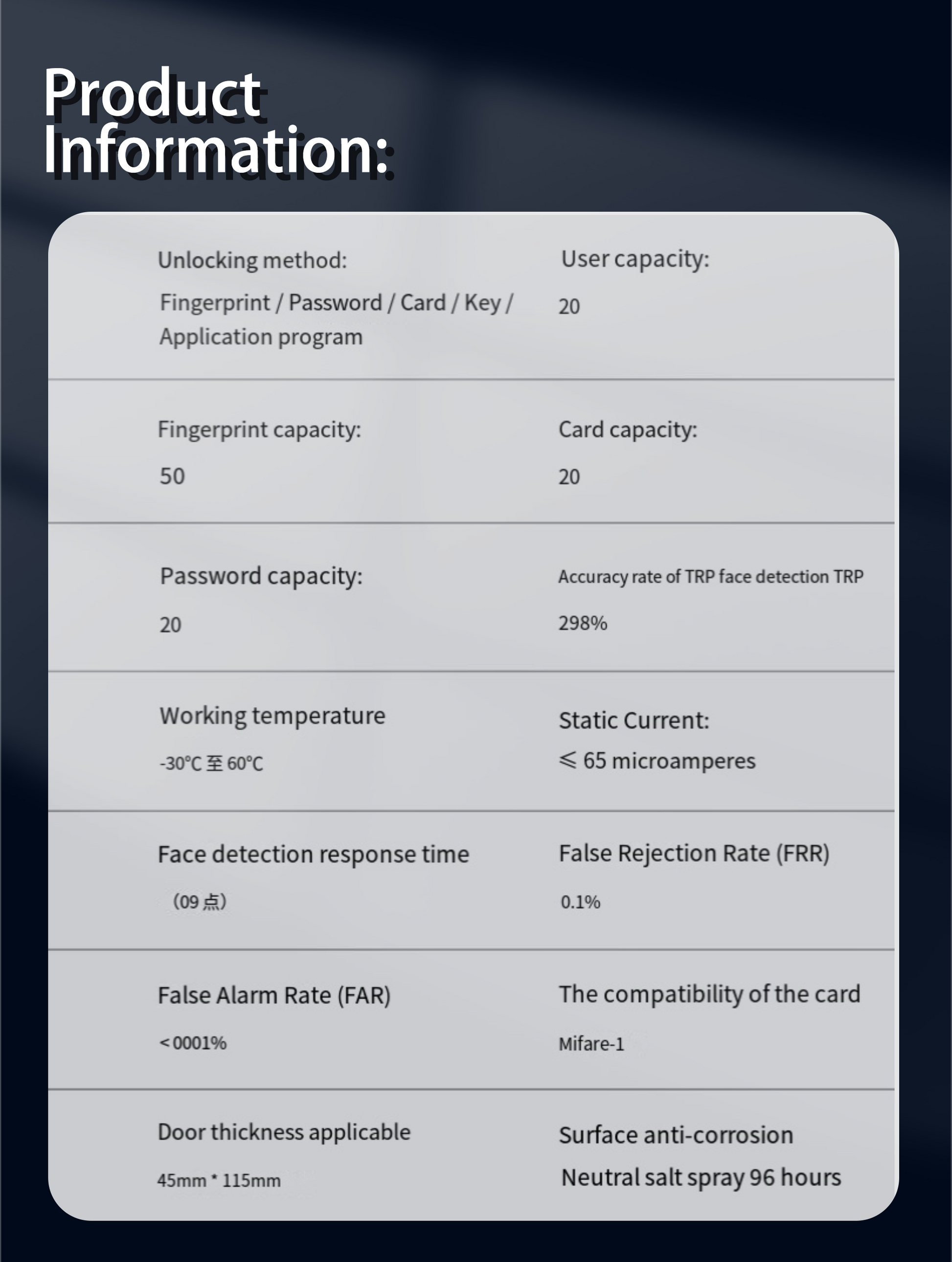 Model: K301 | Unlock Methods: Fingerprint | Password | Card | Key | Face Recognition | App | Fingerprint Capacity: 50 | Password Capacity: 20 | Card Capacity: 20 | User Capacity: 20 | Accuracy (Face Detection TRP): 298% | FRR: 0.1% | FAR: <0.001% | Working Temp: –30 °C to 60 °C | Door Thickness: 45 mm–115 mm | Card Compatibility: Mifare-1 | Anti-Corrosion: Neutral Salt Spray 96h