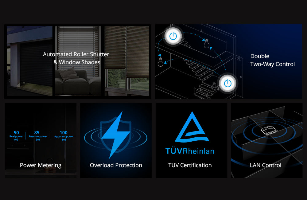 Three working modes available. DUALR3 comes with switch mode, motor mode and meter mode. One of the typical features is roller shutter and window shades smart control in the motor mode. The switch module offers the ultimate flexibility for your roller shutter and window shades by app remote control and scheduling timed events no matter whether you are home or away.