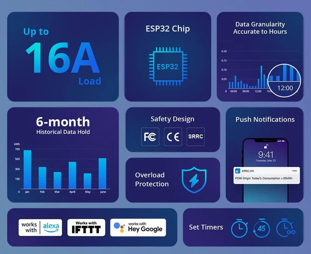 Customizable Overload Safety: Set limits for voltage, current, or power, if exceeded, the switch automatically shuts off to keep your devices safe.