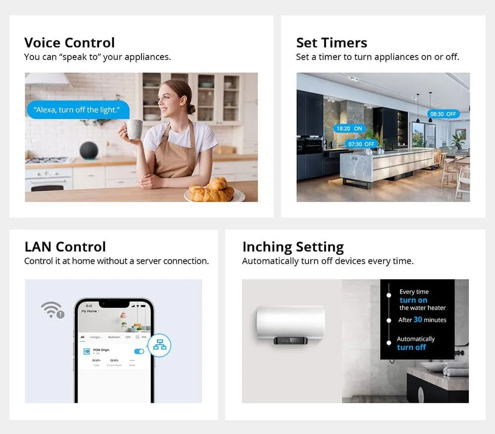 Smart Features Inside: Remote control, schedules, inching mode, power-on state memory, and voice control with Alexa and Google Assistant, everything you need in one smart switch.