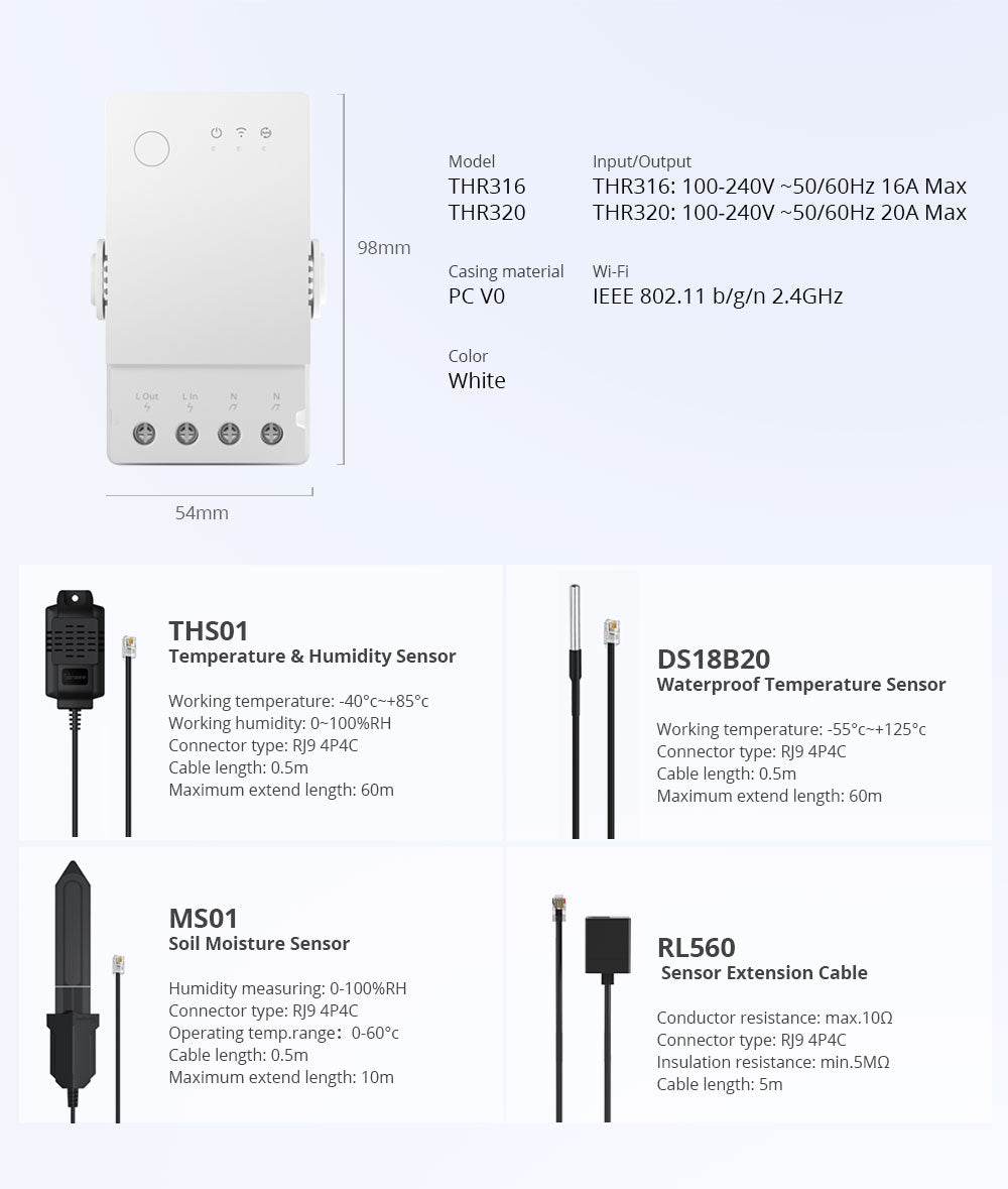 Model: THR316 (16 A) | Input/Output: 100–240 V AC 50/60 Hz | MCU: ESP32 | Wi-Fi: IEEE 802.11 b/g/n 2.4 GHz | Working Temp: –10 °C to 40 °C | Working Humidity: 5–95 % RH non-condensing | Supported Sensors: THS01, WTS01, MS01