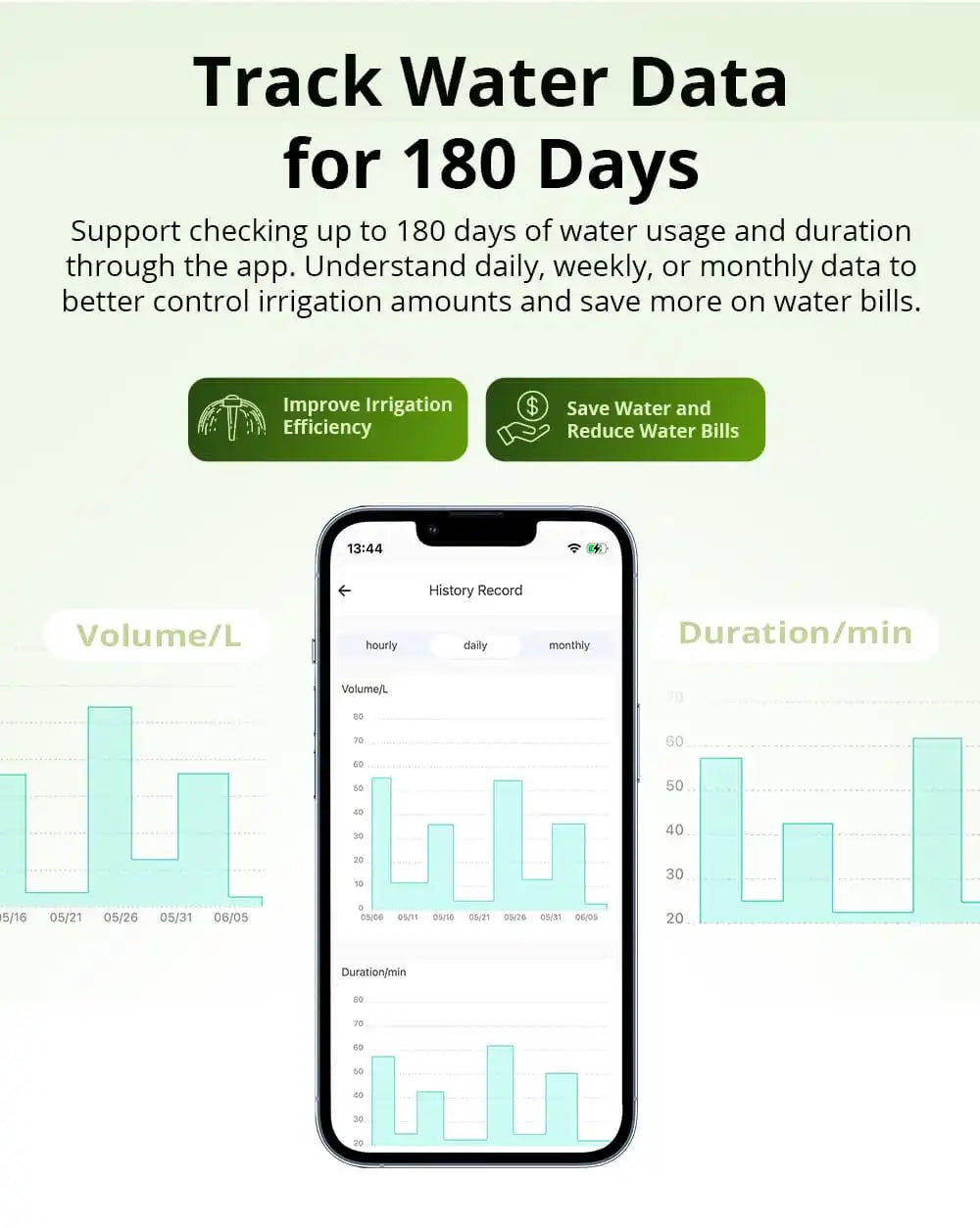 6-Month Water Usage History: Logs usage and duration trends by day, week, or month, export data via app to save water and trim bills.