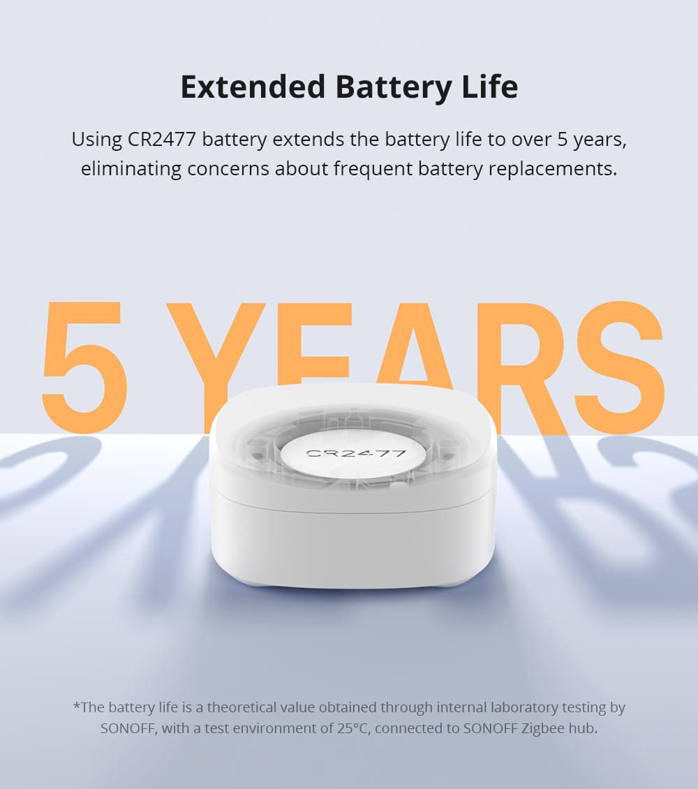 Model: SNZB-05P | Battery: CR2477 | Wireless: Zigbee 3.0 | Detection Level: ≥ 0.5 mm liquid | Range (Wi-Fi): via Zigbee mesh, up to 130 m open space | Dimensions: 48×48×21.6 mm | Temp Range: –10 °C to 60 °C | Humidity: 0–100 % RH